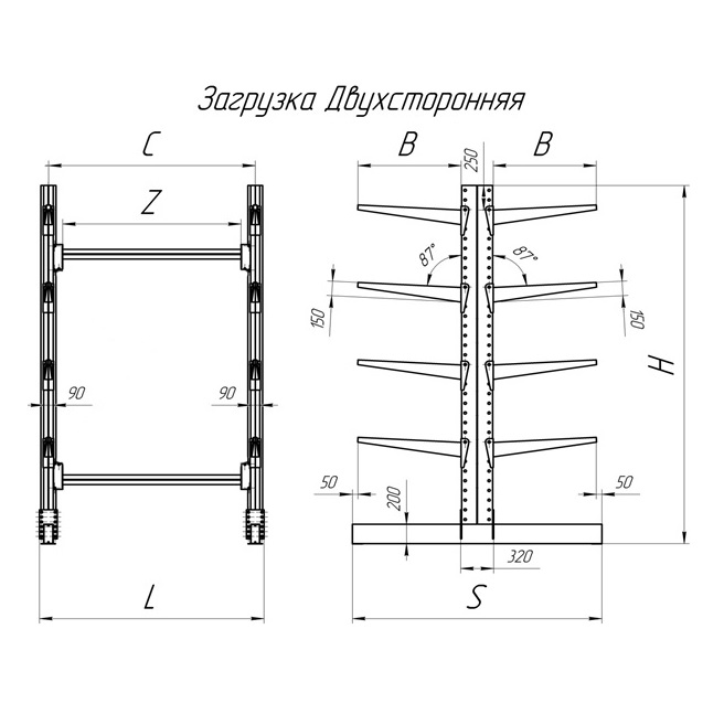 Стеллаж консольный островной металлический (C*S*H) 2000*2900*1500 мм имеет 1 ярус с нагрузкой до 1000 кг на 2 консоли.